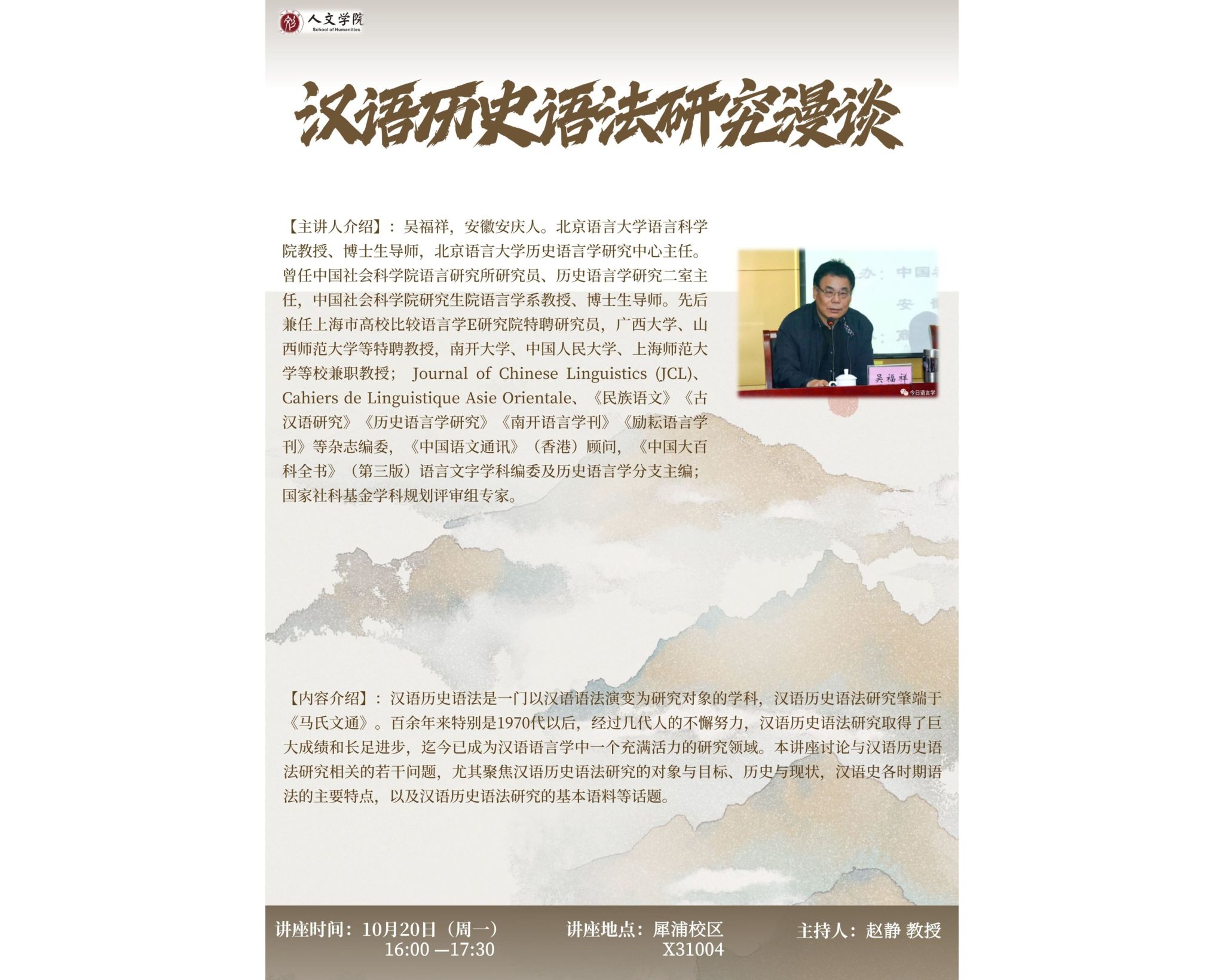 主讲人:北京语言大学语言科学院 吴福祥教授讲座时间:2025年10月20日(周一) 16:00-17:30讲座地点:犀浦校区X31004会议室主办单位:包子漫画 主持人:包子漫画 赵静教授