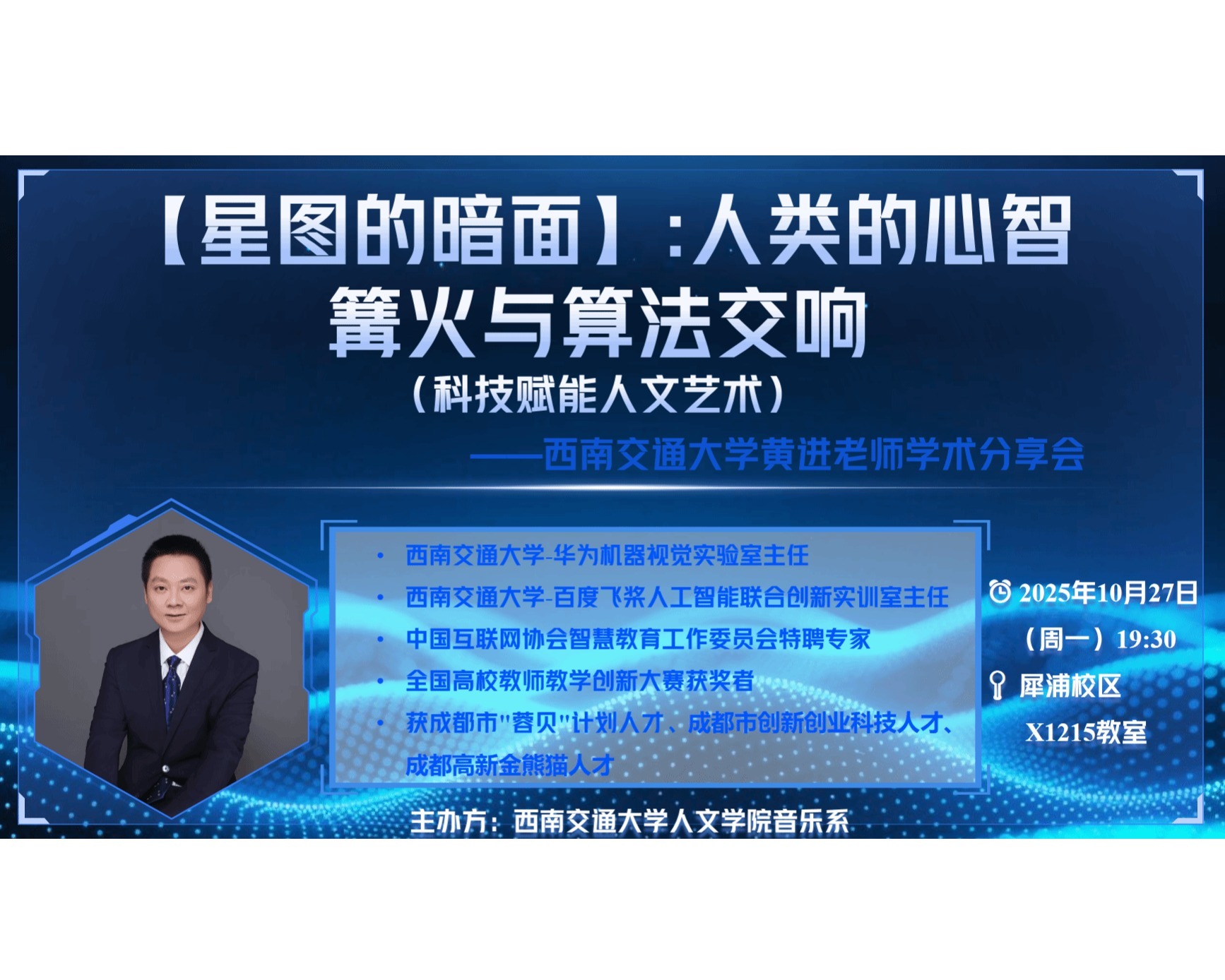 主讲:黄进 副教授时间:2025年10月27日下午19:30-21:05地点:犀浦校区X1215教室主讲人简介:现任西南交通大学-华为技术有限公司机器视觉联合实验室主任,西南交通大学-百度飞桨人工智能联合创新实训室主任,中国互联网协会智慧教育工作委员会特聘专家,长期从事图像处理与计算机视觉、深度学习与人工智能方向的教学科研工作。出版书籍1部,主持/参与省部级教改项目近10项、国内外期刊/会议发表学术论文20余篇,受邀在学术研讨、...