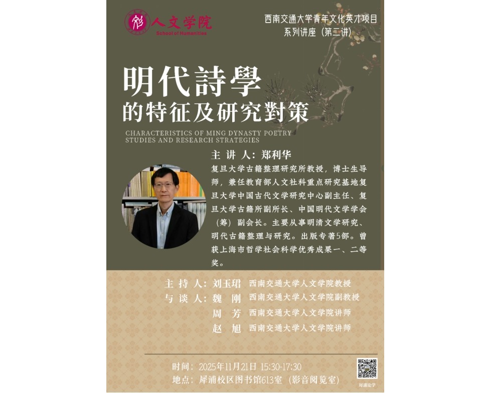 主讲人:复旦大学古籍整理研究所 郑利华教授讲座时间:2025年11月21日 15:30-17:30讲座地点:犀浦校区图书馆613室(影音阅览室)主办单位:包子漫画 主持人:包子漫画 刘玉珺教授主讲人介绍:郑利华,复旦大学古籍整理研究所教授,博士生导师,兼任教育部人文社科重点研究基地复旦大学中国古代文学研究中心副主任、复旦大学古籍所副所长、中国明代文学学会(筹)副会长。主要从事明清文学研究、明代古籍整理与研究。...