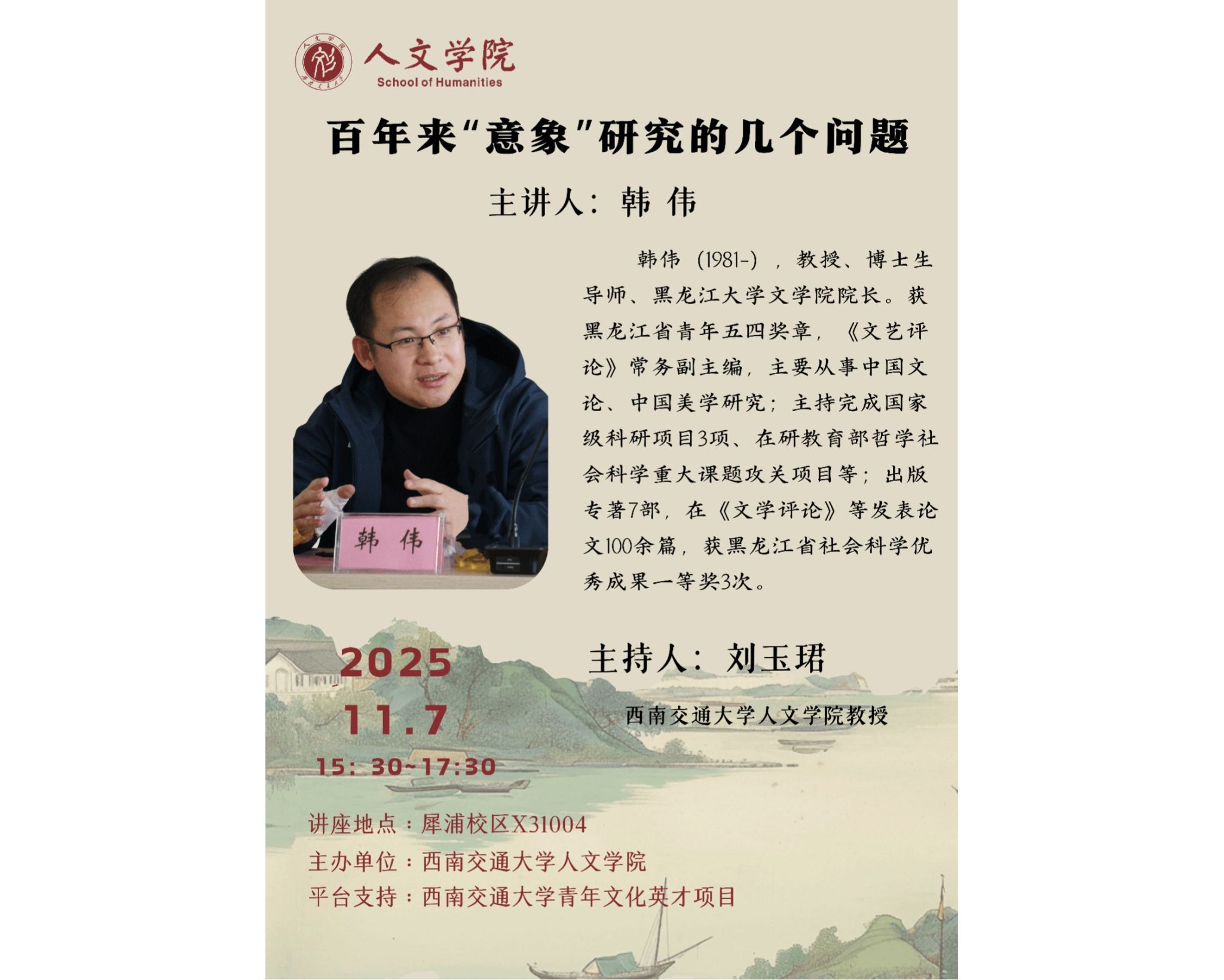 主讲人:黑龙江大学文学院院长 韩伟教授讲座时间:2025年11月7日 15:30-17:30讲座地点:犀浦校区X31004会议室 主办单位:包子漫画 主持人:包子漫画 刘玉珺教授主讲人介绍:韩伟(1981—),教授、博士生导师、黑龙江大学文学院院长。多次入选国家级青年人才计划,获黑龙江省青年五四奖章,《文艺评论》常务副主编,主要从事中国文论、中国美学研究;主持完成国家级科研项目3项、在研教育部哲学社会科学重大课题攻关项目等;...