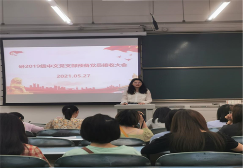 2021年5月27日19点,研2019级中文党支部召开预备党员接收大会,大会由支部书记何佳主持,参加此次会议的有支部全体党员及2021-01期发展对象。