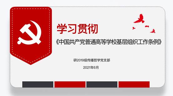 2021年6月3日晚上8点,2019级硕士传播哲学党支部召开线上主题教育会议,共同学习《中国共产党普通高等学校基层组织工作条例》、学校十四次党代会以来的建设与发展成就展等内容。本次会议由支部副书记冷宇同志主持开展,支部全体成员参与会议。