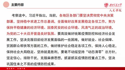 首先,党支部书记李艳菲同志带领大家学习了本次重要讲话的主要内容。中共中央总书记、国家主席、中央军委主席习近平近日在四川考察时强调,要坚决贯彻党中央决策部署,弘扬伟大建党精神,坚持稳中求进工作总基调,完整、准确、全面贯彻新发展理念,主动服务和融入新发展格局,统筹疫情防控和经济社会发展,保持经济稳定发展,保持社会大局稳定,推动治蜀兴川再上新台阶,在全面建设社会主义现代化国家新征程上奋力谱写四川发展新篇章,以实际行动迎接党的二十大胜利召开。同时,习近平总书记还十分牵挂雅安芦山地震中受伤人员的救治和灾区人民的生产生活,关注国家粮食生产、乡村振兴、家训家风建设、长江上游生态建设、毕业生就业创业、民营经济发展与科技创新等有关国计民生的问题。
