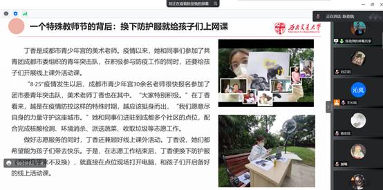 本科音乐党支部、本科广告党支部联合推出的抗疫歌曲MV《“艺”起前行,同舟共济》。抗疫歌曲MV真切朴实,参会成员深受感动,纷纷展开讨论,依次分享感人事迹与心得体悟。蔡依琳同志分享了母女同行抗疫的鄢建华和她的女儿叶蕊。陈劲骁同志分享了“汶川哥哥”张自立在泸定县6.8级地震发生后,积极投身搜救行动。研2022级中文团支部李春雨同学分享了在成都市防疫过程中,金牛区卫健局众志成城、奋力抗疫,坚持听党话,跟党走,始终秉持“医”心为民,做生命的守护者。颜曦同学总结道,在新时代的背景下,我们应当充分发挥伟大抗疫精神与抗震救灾精神的时代价值,激发社会正能量,筑牢中国特色社会主义的意识形态基础,助推中华民族伟大复兴的早日实现。