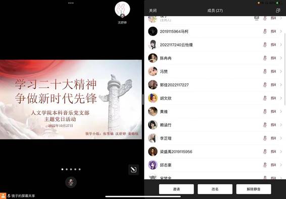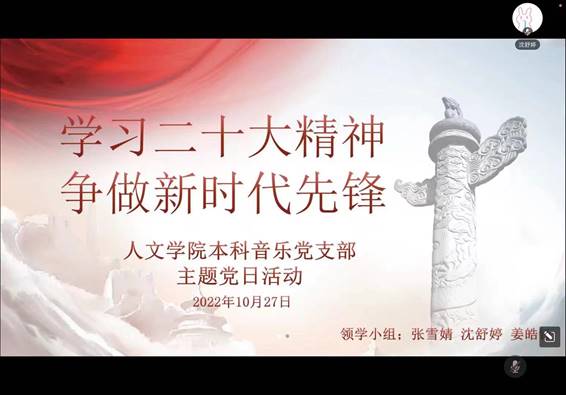 为深入学习贯彻党的二十大精神,感悟思想伟力、汲取奋进力量,2022年10月27日下午1时,本科音乐党支部通过线上会议的形式,开展“学习二十大精神·争做新时代先锋”主题党日活动,引导师生切实把思想、认识和行动统一到党的二十大精神上来。