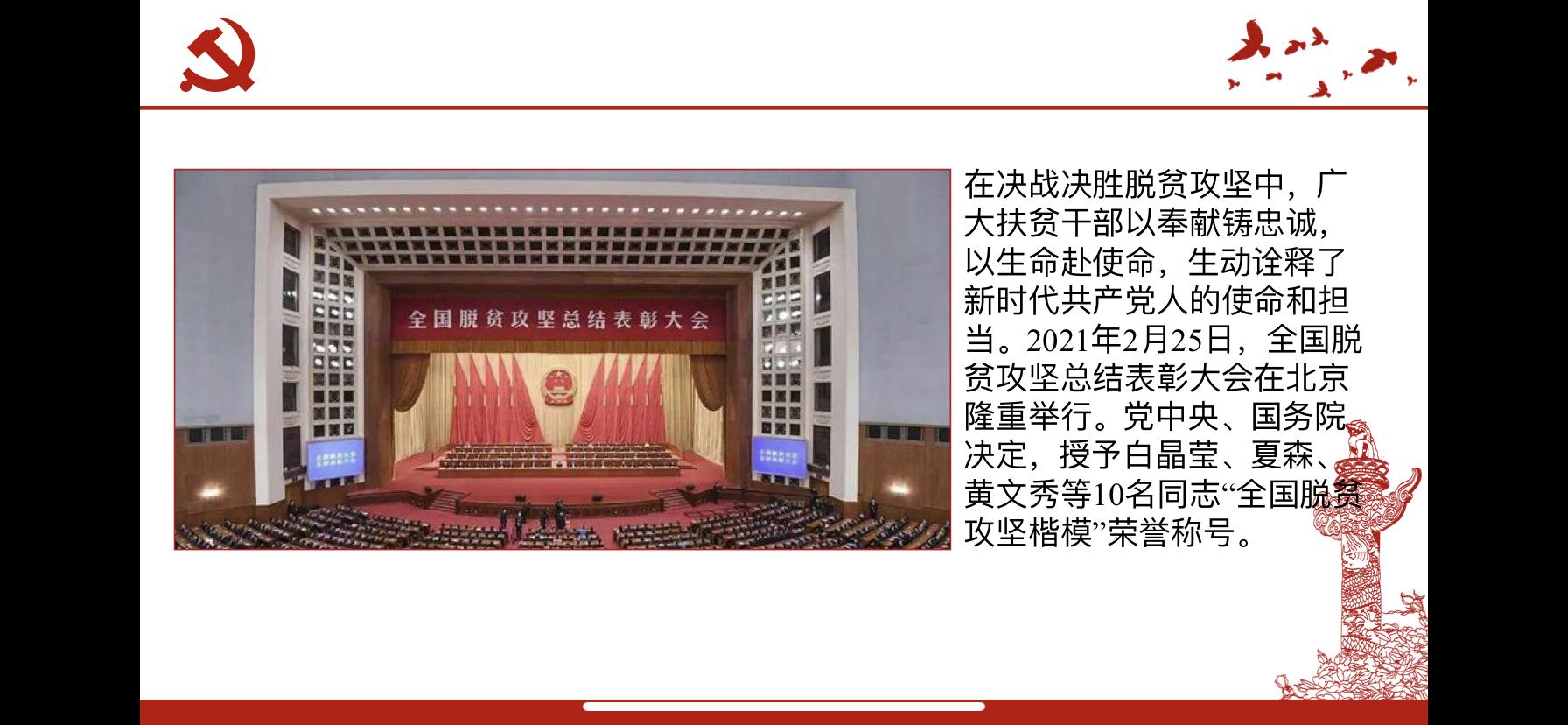 随后,由周欣叶同志与黄欢同志讲述脱贫攻坚精神背后的感人故事。脱贫攻坚精神是在脱贫攻坚伟大斗争中锻造形成的,是中国共产党性质宗旨、中国人民意志品质、中华民族精神的生动写照,赓续传承了伟大民族精神和时代精神。而在脱贫攻坚伟大斗争中,涌现出许多先进党员代表。“全国脱贫攻坚楷模”白晶莹同志立足实际,带领当地妇女开展刺绣培训班,以绣花精神推动当地脱贫。而另一位楷模张桂梅校长则致力于教育事业,扎根边疆教育一线40余年,帮助1800多名女孩走出大山走进大学。她将对党的深厚感情转化为立德树人的实际行动,潜移默化中让革命精神、爱国情操、红色基因融入孩子们的血液,代代相传。