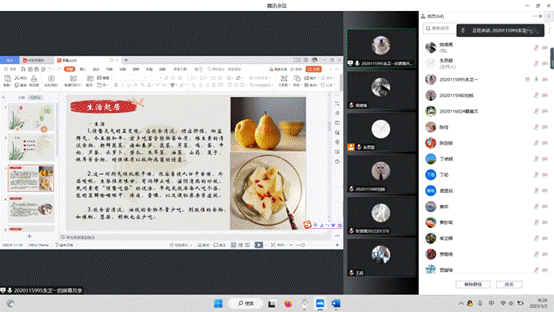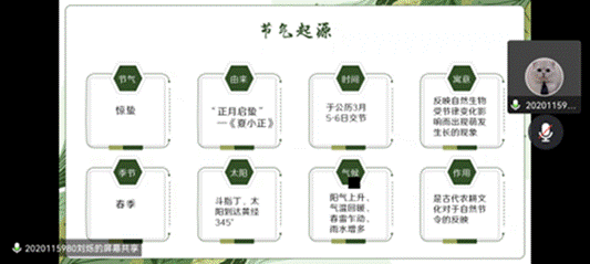 最后由第四小组分享“惊蛰”节气相关的养生知识。朱芷一同志从生活起居、养生保健、运动健康三个方面向大家介绍养生知识,提醒同学们“惊蛰”节气虽标志着万物复苏,但天气还总会乍暖还寒,气候也多偏干燥,容易口干舌燥、上火,引起身体不舒服,因此需要注意防寒,注重养生。