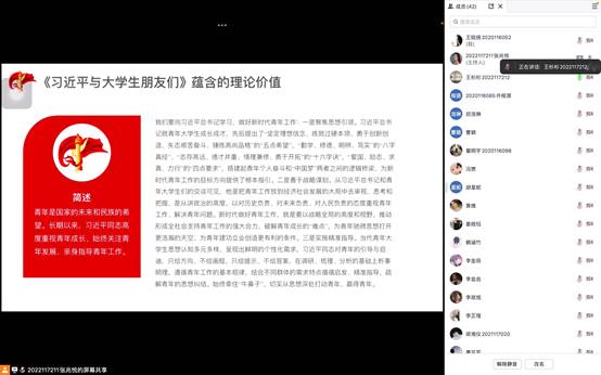 本科音乐党支部线上开展了“习近平总书记与大学生在一起”主题党日活动。本次会议由孙雨函、张兆悦、闻茜和王杉杉担任领学人,支部全体同志参与活动。