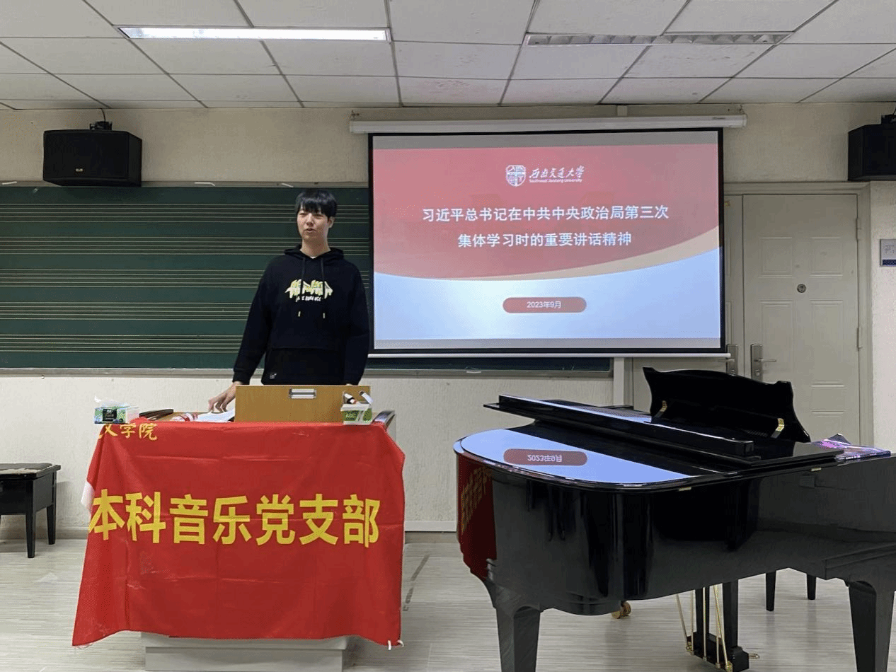 2023年10月12日下午2时,本科音乐党支部在音专一教室开展主题教育专题学习会,会议集中学习了习近平总书记在中共中央政治局第三次集体学习时的重要讲话精神和习近平总书记在中共中央政治局第六次集体学习时的重要讲话精神。本次学习会由邱志豪、李政旭、郭佳和吴呈昊四位同志担任领学人,支部全体同志参与学习。
