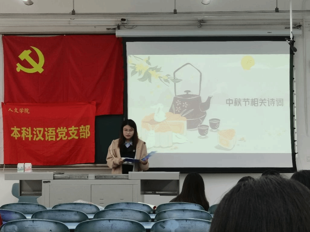 随后,第三小组的吕晴同志带领大家赏析有关中秋节的诗词歌赋。“西北望乡何处是,东南见月几回圆”“海上生明月,天涯共此时”……意蕴绵长的诗句让在座的同志们纷纷忆起了往昔的中秋节。吕晴同志还结合汉语专业特色,从字词、结构、内容、情感等多个专业角度为大家赏析了四首中秋诗词,使同志们充分感受到中秋的诗词韵味。