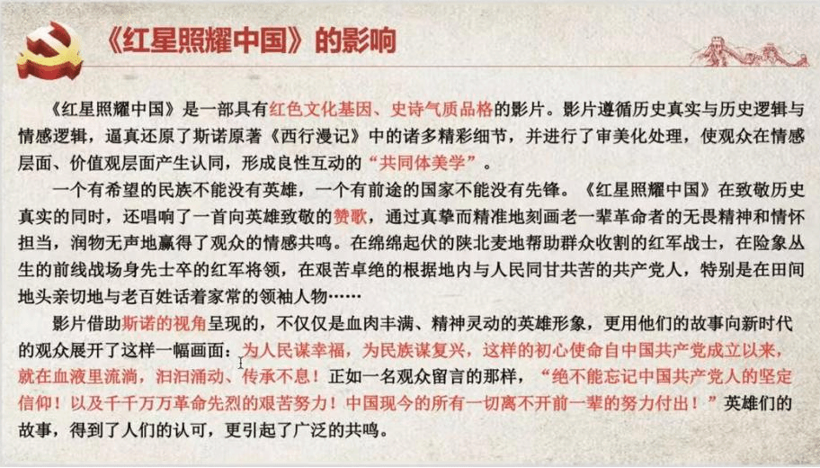 随后,贾璇琦同志针对《红星照耀中国》这部影片的角色和影响进行分析。在播放了电影的一些片段后,贾璇琦同志强调当时新生的中国共产党多次面临生死存亡的局面,但毛泽东、周恩来等领导人的睿智使中国共产党走上了正确的道路,中国共产党团结一切可团结的力量,带领中华民族进行着不屈不挠的顽强抗争。