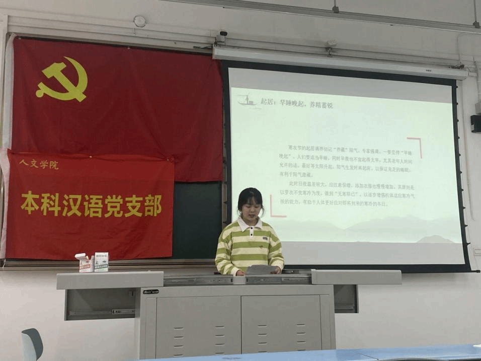 其次,第二小组的朱思颖同志向大家科普寒衣节的节气养生妙招。寒衣节起居要切记“养藏”阳气,早睡晚起,养精蓄锐;饮食上,要注意增加热量,温补益肾,少吃“发”的食物,可以适当吃酸性食物;运动方面不可运动过度,要注重防寒保暖;寒衣节时天气阴冷,要多晒太阳、多听音乐来舒缓情志,保持乐观。