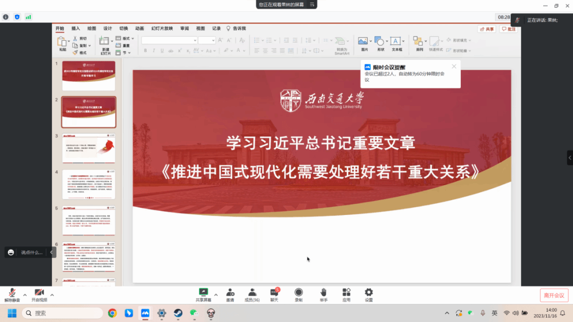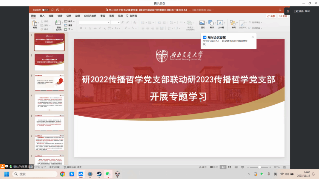 为进一步加强思想政治建设,坚定党员理想信念,2023年11月16日下午,研2022级传播哲学党支部联动研2023级传播哲学党支部,依托腾讯会议平台开展专题学习。本次学习会议由研2022级传播哲学党支部宣传委员钟国玲同志主持,两个支部全体党员及入党积极分子参与。