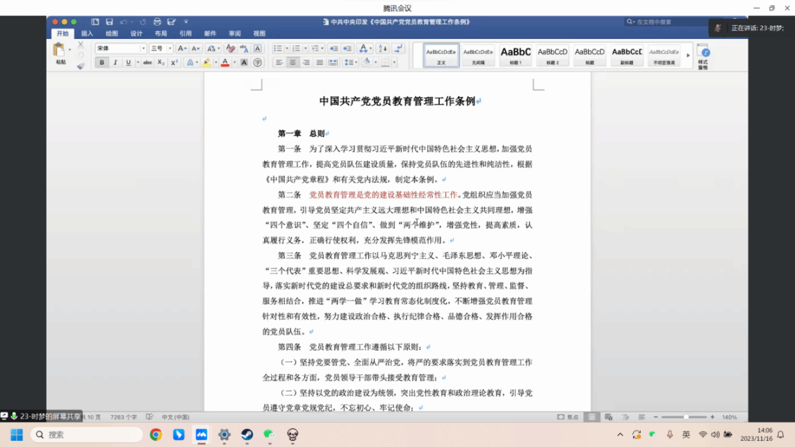 接着,研2023级传播哲学党支部的组织委员时梦同志带领大家学习了《中国共产党党员教育管理工作条例》。她指出,党员同志要严格遵守条例要求,以一名优秀共产党员的高标准严格要求自己,深入学习贯彻习近平新时代中国特色社会主义思想,不断增强思想的先进性和纯洁性。