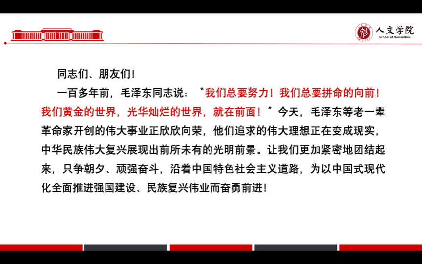 晚上8时,会议结束。通过本次学习,本科广告党支部全体成员充分认识到毛泽东同志在新中国成立及发展过程中起到的伟大作用,认识到作为新一代青年人的历史使命,大家积极讨论,充分彰显了为以中国式现代化全面推进强国建设、民族复兴伟业而奋勇前进的坚定决心。