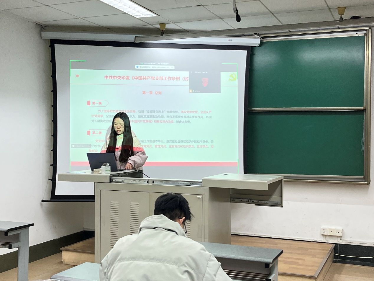 为深入学习贯彻党的二十大精神,巩固党史学习教育成果,加强支部党员的党性修养,培育深化爱国主义情怀,2024年3月5日(周二)晚上19:30研究生2021级传播哲学党支部在九里校区4304A教室开展3月份主题教育学习活动,全体党员、预备党员、入党积极分子参加会议,会议由研究生2021级传播哲学党支部书记陈子龙同志主持。主要开展了对习近平总书记在中共中央政治局第十一次集体学习时的重要讲话精神、《党史学习教育工作条例》《厚植爱国情怀 培育时代新人》《中国共产党支部工作条例(试行)》4项内容的集中统一学习。