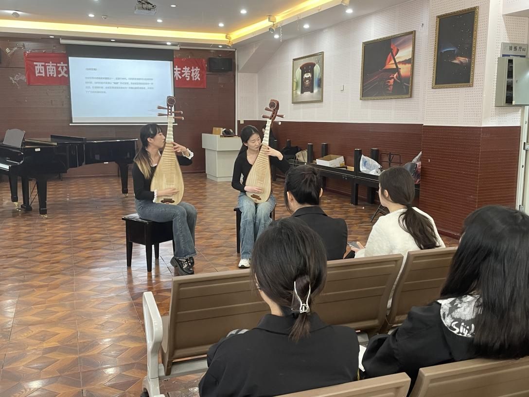 最后,音乐系专业同学热情邀请本科汉语党支部的同志们进行器乐体验,大家尽情体验了琵琶、中阮、古筝三种中国民族民间传统弹拨乐器,进一步感受了民乐的魅力。通过本次活动,两支部成员一致认为,民乐是中华优秀传统文化的重要组成部分,需要给予重视并持续传承,以更好地构建中华民族独特的情感世界。