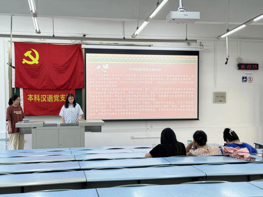 2024年9月19日15:50,本科汉语党支部于X2214教室开展主题党日活动,由满珍明同志主持,支部全体成员参加学习。本次活动包括两个主题:一、学习学校党纪学习教育总结会议精神,复盘总结支部党纪学习教育情况;二、开展主题为“中华传统美德”的特色主题党日活动。