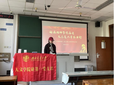 研第一党支部于九里校区J4322教室举办了“传承精神擎旗奋进,矢志复兴青春力行”纪念中国人民抗日战争暨世界反法西斯战争胜利80周年学习教育活动。在本次活动中,支部邀请了西南交通大学“红路”理论学讲团成员安佳佳同志做“烽火岁月中的英雄赞歌”主题宣讲,同时,支部成员组织演绎了“遵义会议”主题情景剧。活动由满珍明同志主持,研第一党支部全体成员到会学习。