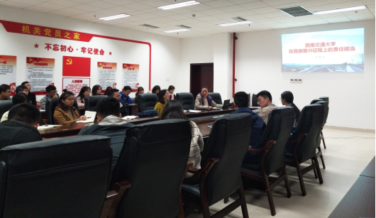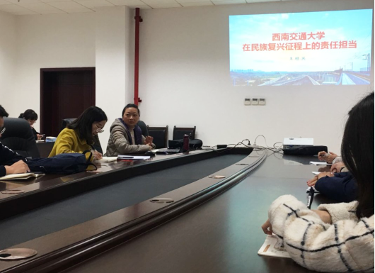 按照“不忘初心、牢记使命”主题教育的要求,为更好地聚焦学习贯彻习近平新时代中国特色社会主义思想这条主线,帮助党员干部以理论滋养初心、以理论引领使命,增强“四个意识”、坚定“四个自信”、做到“两个维护”,11月4日下午,校党委书记王顺洪从“科研报国、薪火相传”“使命不息、群星璀璨”“对全体党员的要求和希望”三个方面,以师生校友中一个个身边共产党员的典型例子,生动、全面、深刻地回顾并阐述了西南交通大学在民族复兴征程上的责任担当,为全校中层干部及学生党员代表讲授了一堂精彩而又深刻的主题教育专题党课。本次会议主讲人陈璐同志结合个人参会学习心得和亲身经历向同志们解读了王顺洪书记的讲话内容。