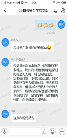 硕士2018级中文党支部以“致敬最美逆行者”为主题通过QQ群开展了分享交流会,支部书记带领大家学习了“疫情上报第一人”张继先、八十高龄仍坚持战“疫”的钟南山,以及四川华西援鄂医疗队的感人故事。看到各行各业的人都在为战“疫”努力,大家纷纷表示,作为学生党员,更要充分做好表率,在家中认真学习,不出门,配合疫情防控工作开展,就是为这场战役做贡献。