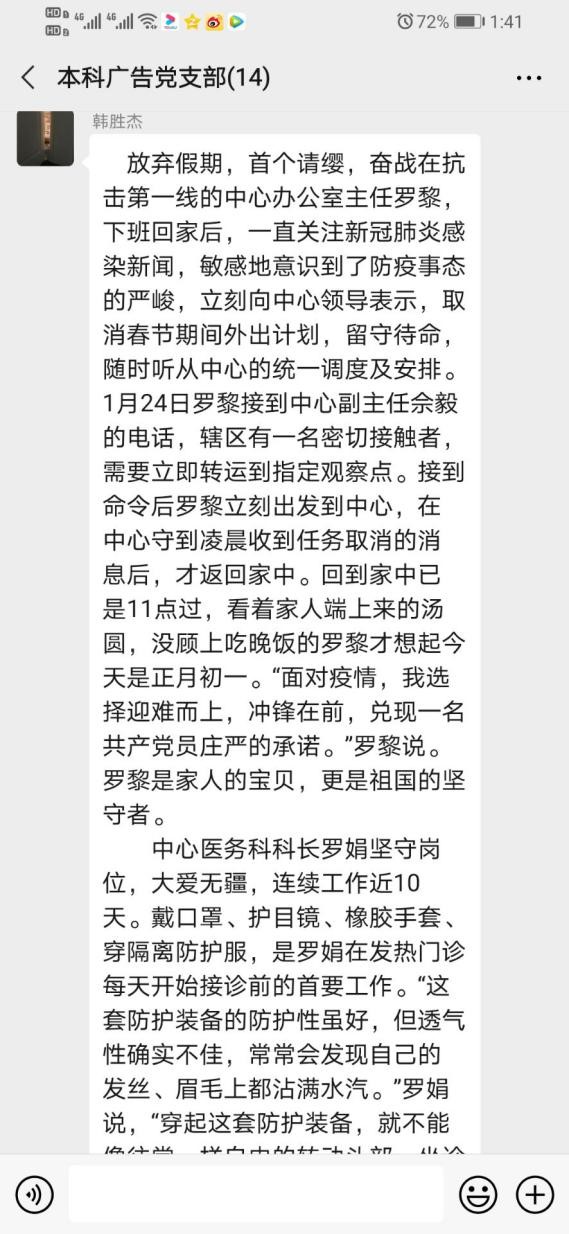 本科广告党支部在线上开展“学习榜样守初心,主动作为担使命”专题党日活动。活动主要内容为疫情期间,我们发现身边抗疫的榜样人物和先进事迹,学习交流他们身上的担当与光辉,激励自己履行责任与使命。本次活动由支部副书记徐丹同志主持。