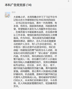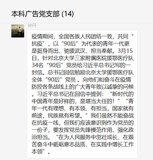 本科广告党支部在微信群中开展有关“学习贯彻习近平总书记重要回信精神”主题党日活动。活动主要内容为学习习近平总书记对在首钢医院实习的西藏学生以及战疫过程中北京大学援鄂医疗队全体“90后”党员的回信。本次活动由支部张宇同志主持。