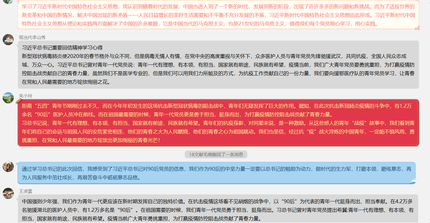 硕士2018级中文党支部在线上顺利开展了本学期第二次线上组织生活会,本次生活会以学生党员线上学习文件,学习PPT,支部成员轮流发言讨论等形式展开,由支部书记叶小维主持,硕士2018级中文党支部全体党员、预备党员参与。