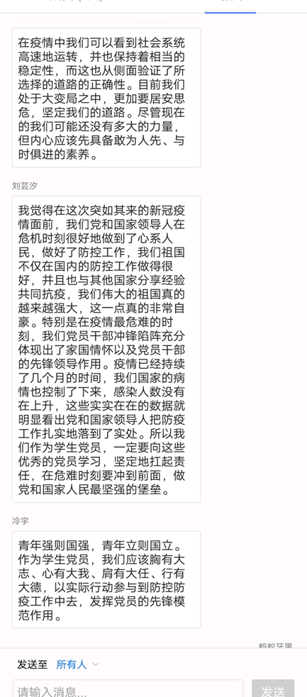 2019级传播哲学党支部的党员同志们相聚云端,围绕习近平总书记在统筹推进新冠肺炎疫情防控和经济社会发展工作部署会议上的重要讲话精神和习近平总书记关于百年未有之大变局的重要论述两个专题进行学习。学习内容主要分为两个板块,一是学习贯彻习近平总书记关于统筹推进新冠肺炎疫情防控和经济社会发展的重要讲话精神、深刻把握新时代党的历史使命,坚定理想信念,保持政治定力。二是支部党员同志分享感受体会。同志们反映积极,有同志说我们应该具备敢为人先、与时俱进的素养,也有同志提到青年强则国强,作为学生党员,应当胸怀大志,发挥党员先锋作用。最后,本次专题学习在无声的讨论中落下帷幕。