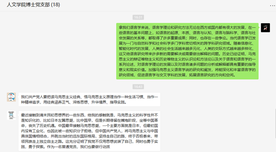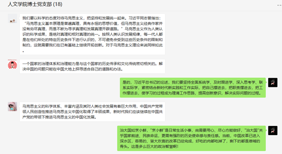 博士党支部在微信党支部群里进行了线上主题党日活动。活动主要内容为深入学习领会习近平总书记关于学习马克思主义经典、关于坚持和完善中国特色社会主义制度、推进国家治理体系和治理能力现代化的重要论述。
