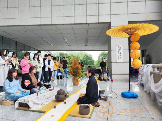 在校图书馆2楼,现场设置了图书展,茶文化体验区和健康阅读体验区。书展为师生提供了许多经典书籍和文创产品,健康阅读体验区为同学们提供了阅读和生活中的舒缓体验,旨在为同学们缓解压力,放松身心。茶文化体验区邀请了茶艺师为同学们讲解茶文化,茶艺师还现场展示了点茶的完整流程,包括碎茶、碾茶、罗茶、撮末于建盏、点茶、击拂和置茶托八个步骤。随后,同学们在茶艺师的指导下体验了点茶。最后,同学们品尝了亲手制作的茶,在沁人心脾的茶香体会到其中的文化韵味。