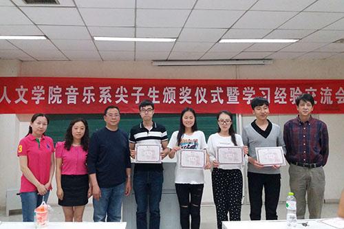 音乐系尖子生颁奖仪式暨学习经验交流会在音乐系一号教室内举行。音乐系系主任刘飞云,教师涂覃平、胡红、杨自力以及音乐系全体学生参与了本次会议。