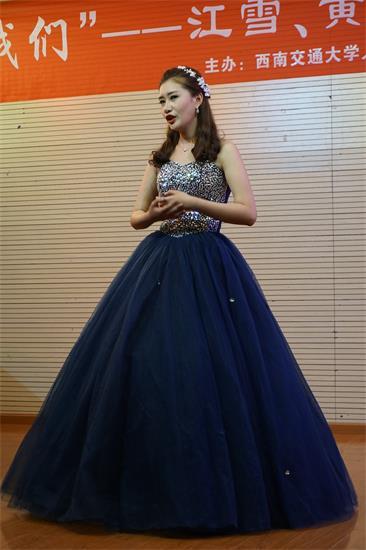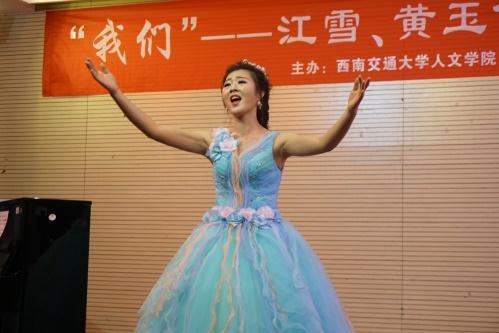 刘教授讲话结束后,晚会正式开始。身着一袭蓝色长裙德邦江雪缓缓走上台舞台,随着钢琴伴奏刘柳老师指尖轻点,悠扬的琴声响彻整个排练厅。江雪率先演唱了《阿尔卑斯山上的牧羊女》《鞭打我吧》这两首充满异域风味的经典歌曲。江雪表演结束后,黄佳玉缓缓走上舞台,为观众们带来了歌曲《天边有颗闪亮的星》《知己红颜》。她婉转动人的歌喉,仿佛在述说一个凄美动人的爱情故事,叹息着“爱也难,恨也难”。