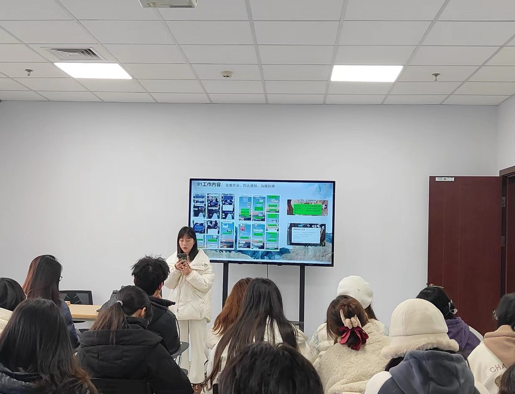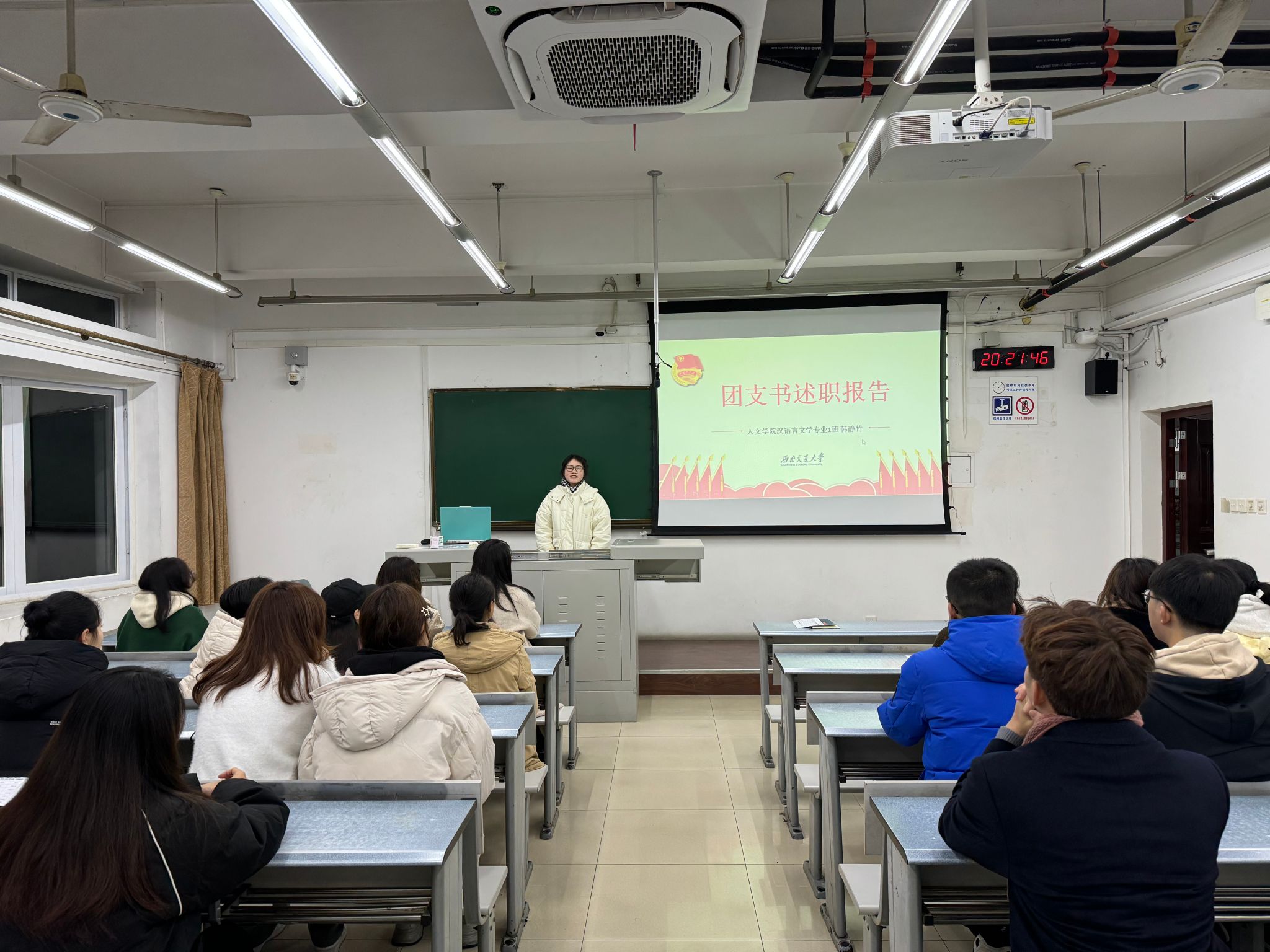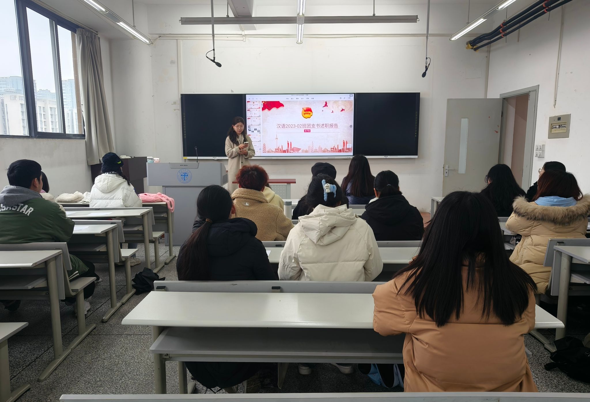 汉语2023级1班班长蒋昕羽对上个学期的班级工作进行了总结。她表示,作为班长,自己一定会继续保持强烈的责任感和充沛的耐心,同时也需锻炼一定的抗压能力。在新的学期,会踏踏实实地、坚持不懈地为同学们干实事,解决大家的问题困惑,督促大家共同进步,不辜负同学们的期望。