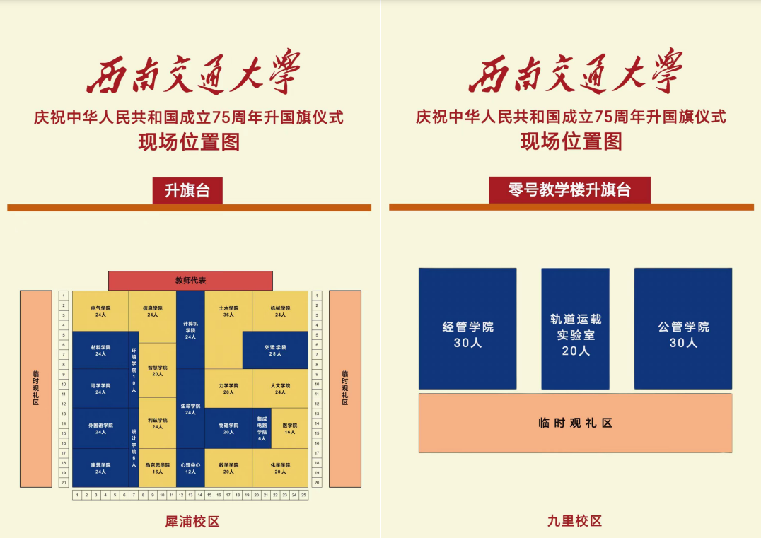 指定观礼区域观礼,请各位老师、各党支部、团支部在学院所在区域旁的临时观礼区、九里校区临时观礼区观礼;