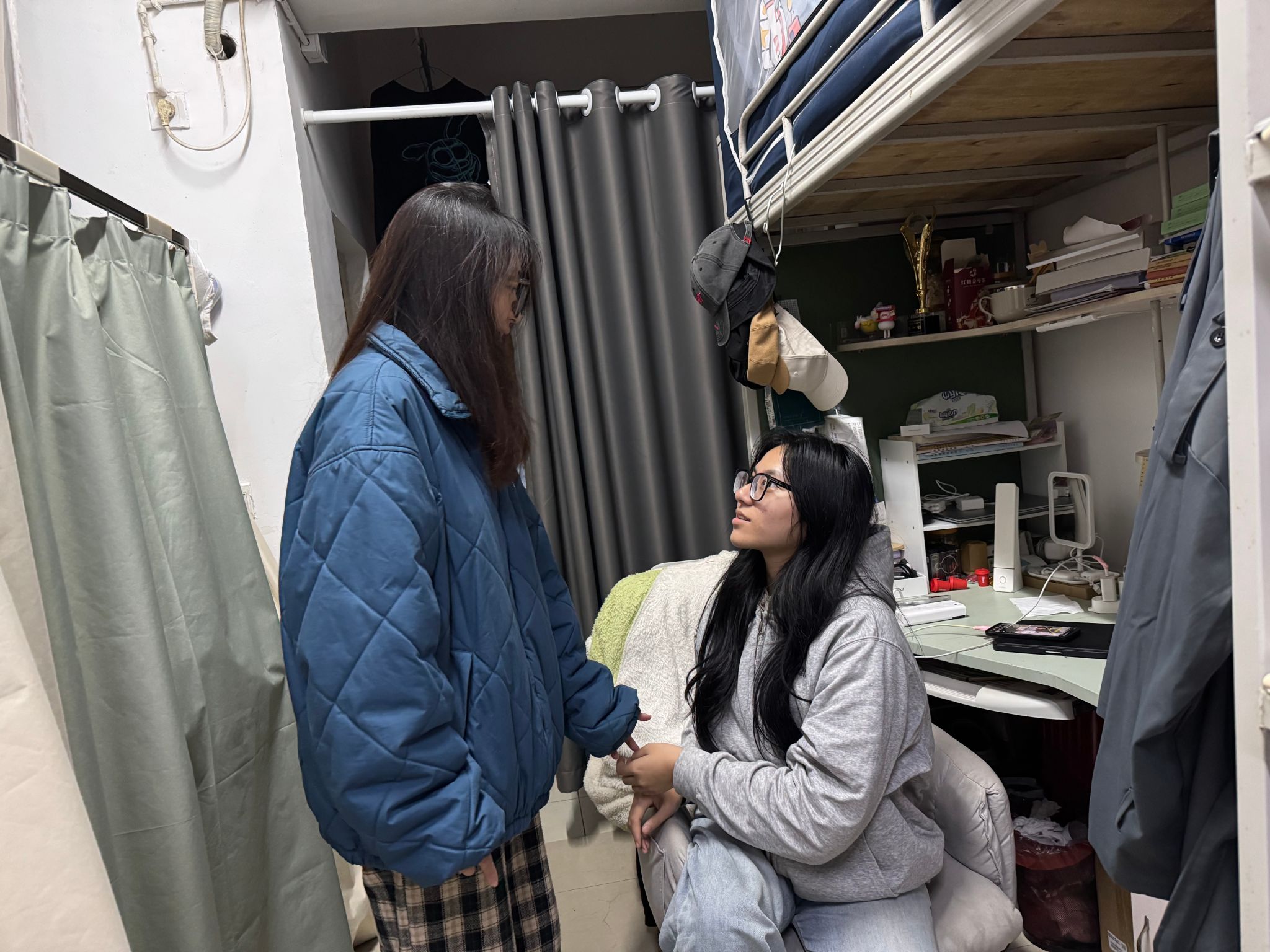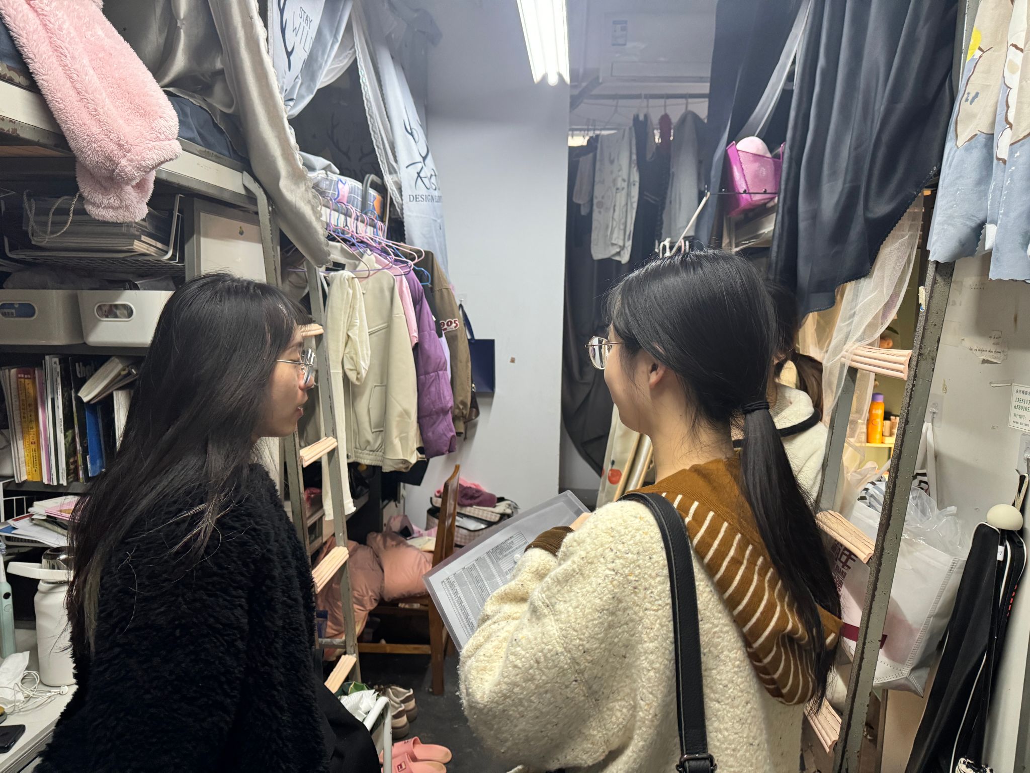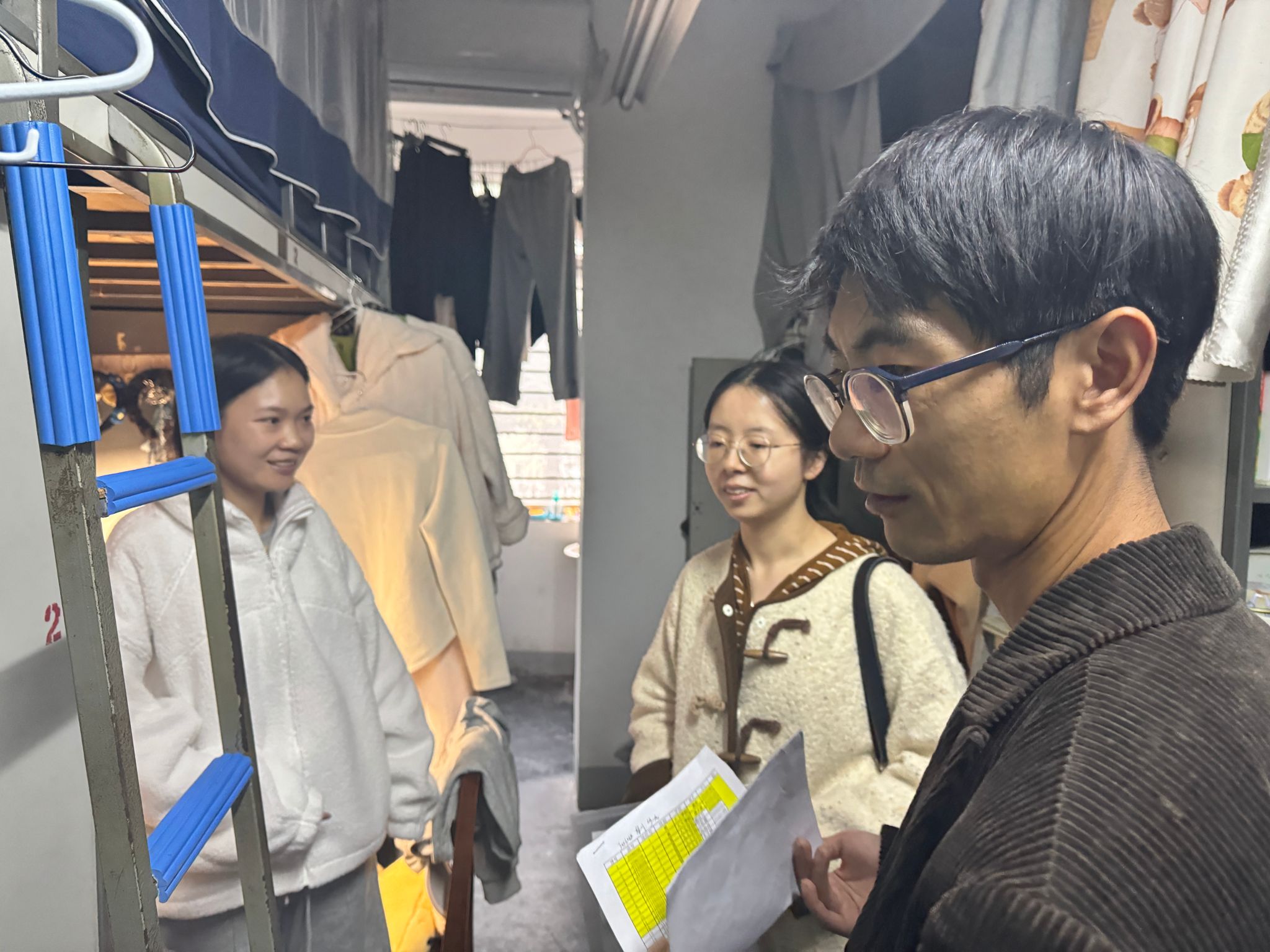 与此同时,本科生辅导员刘晗悦、周桎宏、罗乔美、朱思颖老师前往本科学生宿舍进行走访。在检查宿舍卫生时,老师们发现大部分宿舍都能保持整洁有序,但也存在少数宿舍物品摆放杂乱、垃圾未及时清理等问题。对此,老师们耐心指导同学们进行物品归类和垃圾清理,以确保宿舍环境的整洁与舒适。
