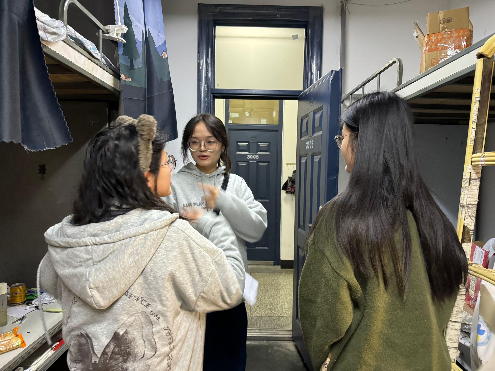 研究生辅导员刘爽、文璐、靳钰涵老师,分别前往了2024级、2023级和2022级研究生宿舍进行走访,与同学们进行了亲切的交流并检查宿舍安全情况。刘爽老师鼓励同学们要珍惜时光,不断提升自己的综合素质和专业能力。靳钰涵老师耐心倾听学生们的学习困惑,以及生活中的点滴小事,并给予了针对性的建议和鼓励。文璐老师提醒同学们要注意劳逸结合,关注身体健康与心理健康,保持良好的学习和生活状态。