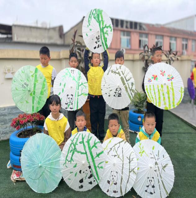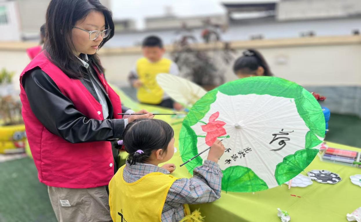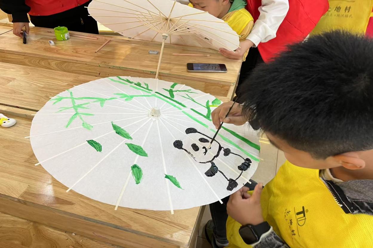 随后,志愿者们带领孩子们亲手制作油纸伞。在志愿者的耐心指导下,孩子们认真绘画,虽然动作略显稚嫩,但每个人都全情投入,现场气氛热烈而温馨。