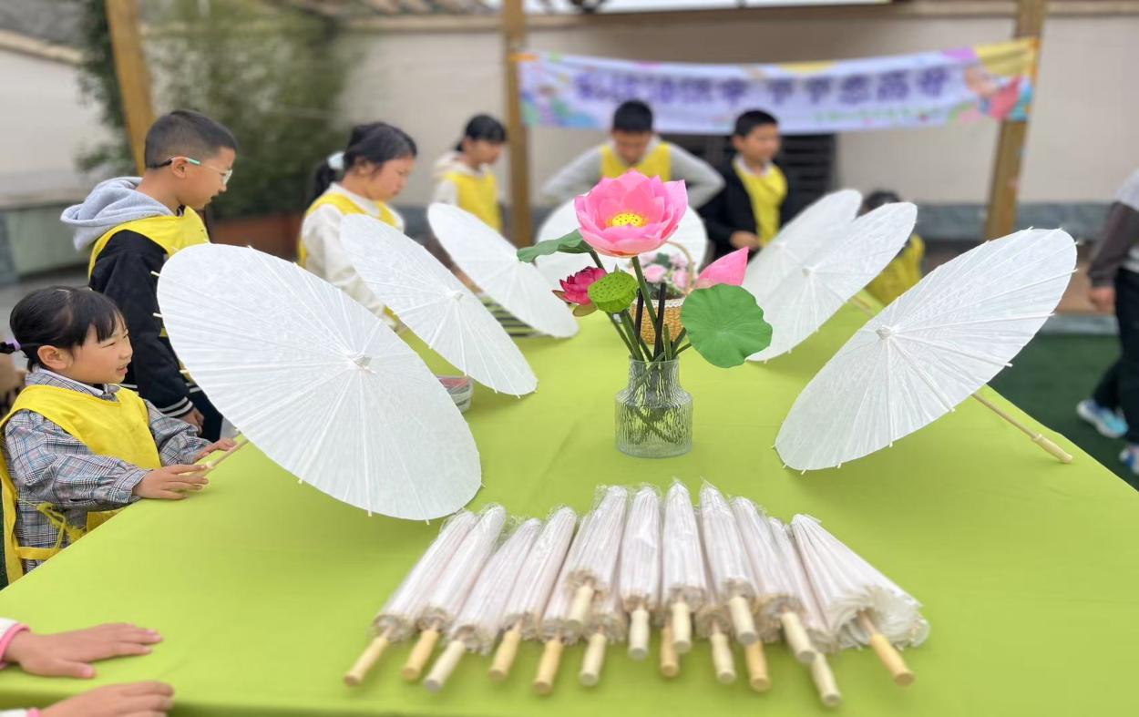 活动伊始,志愿者们把五彩斑斓的油纸伞材料摆放整齐,并为孩子们详细讲解油纸伞的历史、文化内涵和制作工艺。孩子们听得津津有味,眼中满是好奇与期待。