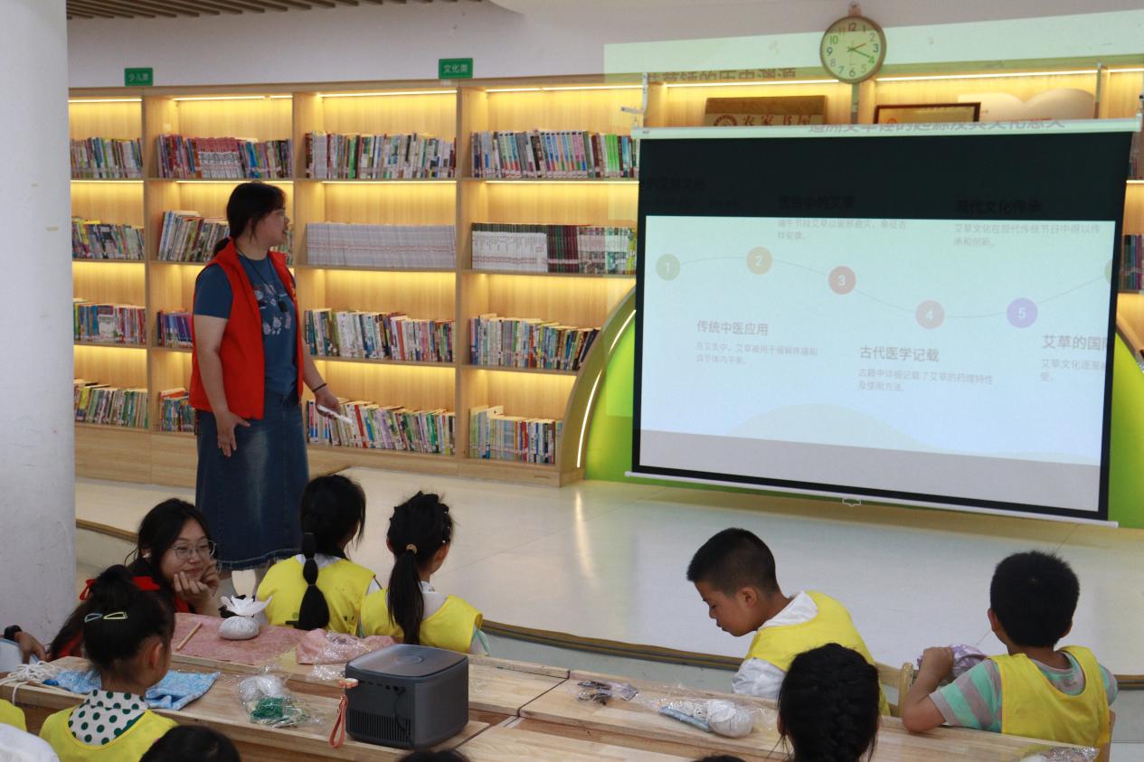 专业特色,以生动易懂的语言向孩子们讲述了端午节的传统习俗与中医药文化,并重点介绍了艾草锤的历史渊源、养生功效及文化内涵。孩子们认真聆听,积极互动,在志愿者的引导下感受中华传统文化的独特魅力。