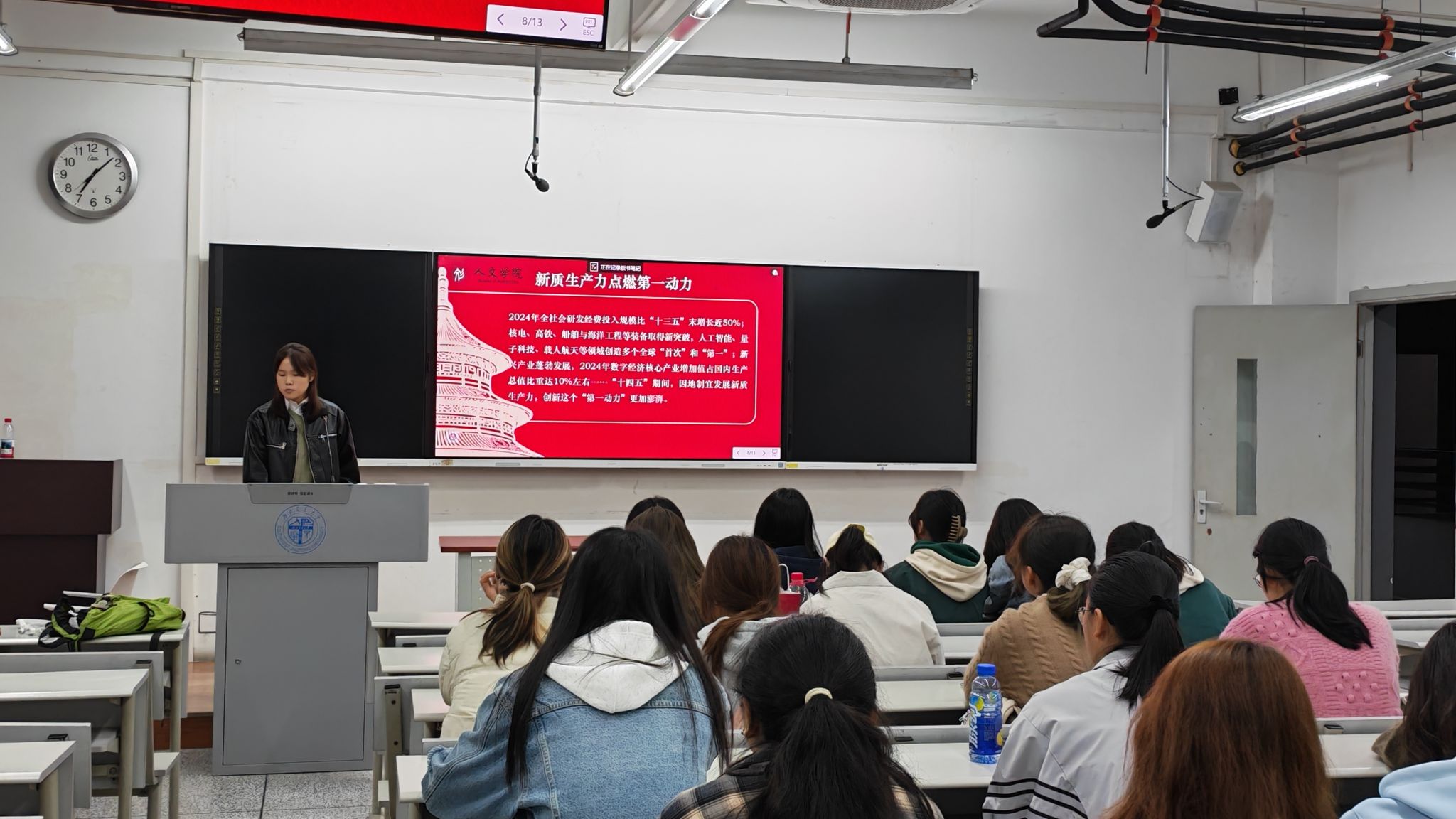 学生会在 X8523 教室举办主题为 “用伟大奋斗创造新的历史伟业” 的思想政治学习会。恰逢党的二十届四中全会审议通过 “十五五” 规划建议的关键节点,学生会全体成员以此次思想政治学习会为契机,回望 “十四五” 辉煌成就,精准锚定 “十五五” 奋斗方向,在理论与实践的碰撞中凝聚青春奋进力量。本次学习,由人文学生会主席韩静竹担任领学人。