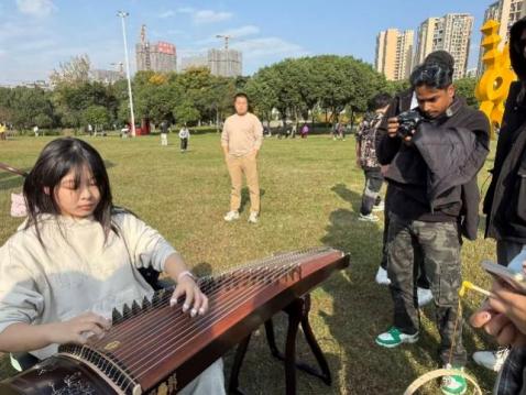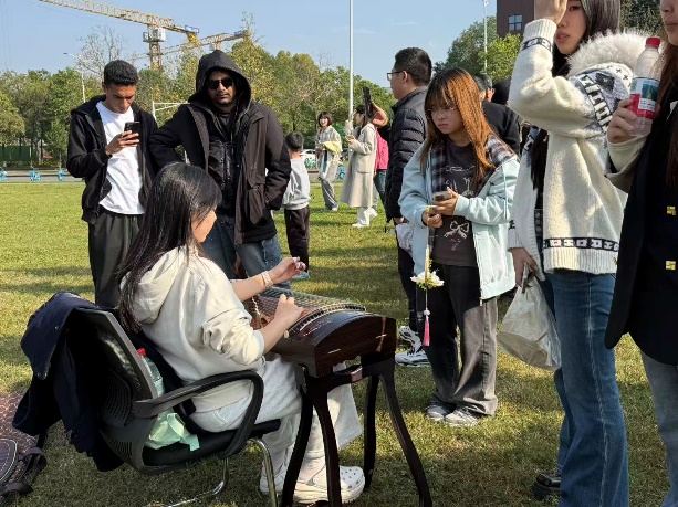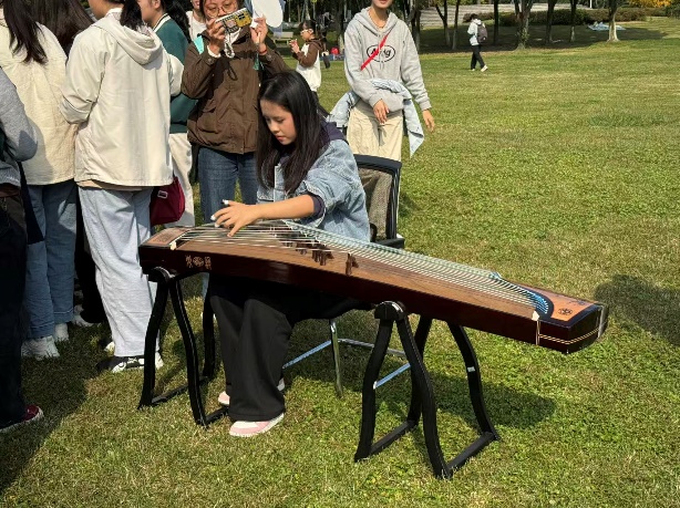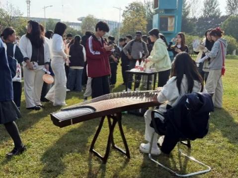 古筝作为中华传统弹拨乐器的代表,起源可追溯至战国时期,其悠扬婉转的旋律承载着东方清雅淡泊的审美意境,是文人雅士抒发情怀、涵养心性的重要载体。活动伊始,古筝表演区便凭借独特的东方韵律聚拢超高人气。演奏者端坐琴前,指尖轻拨琴弦,传统古曲的清雅意境流淌其间,瞬间让现场沉静下来。中外师生纷纷驻足,在听觉沉醉中感受古典音乐的魅力。
