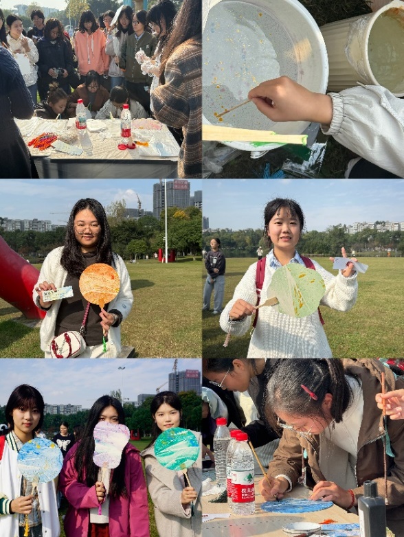漆扇技艺起源于先秦,是融合髹漆、绘画、制骨等多道工序的传统工艺瑰宝。天然漆的温润质感与匠心纹样相得益彰,使其既具实用功能,更蕴含“雅致高洁、吉祥顺遂”的文化寓意,是中华传统生活美学的集中体现。活动现场,志愿者手把手指导调漆、勾线技巧,同学们自由发挥创意,将水墨雅致、浪漫落日、简约花鸟等风格融入创作,更有同学将漆扇与书法结合,让手工创意与笔墨韵味碰撞出独特火花。同学们在亲手创作的过程中,让千年漆艺走出博物馆,成为青年可感知、可创造的文化载体,既锤炼了他们的耐心与匠心,更实现了传统工艺的年轻化表达。