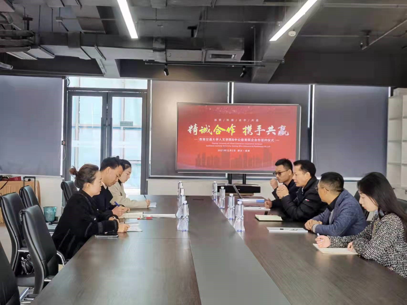 一行老师在中公教育金桦校长的带领下参观了中公教育未来城校区智慧教室、图书馆、学生宿舍等校园环境,了解了中公教育的教学模式和办学方向。双方就如何开展后续合作进行了深入谈话,在明确学生需求的基础上,拟定了后期院企联动的大致方向。随后,中公教育金桦校长在会议室简单介绍了中公教育的发展史及主要业务板块,概述了全国其余院校与中公教育的相关合作;提出本次院企合作主旨是希望满足西南交大学生学历提升、资格证书考取、公职考试等方面的需求,双方可以就学生的成长成才进行教学实习、就业实习、社会实践等方面的合作。