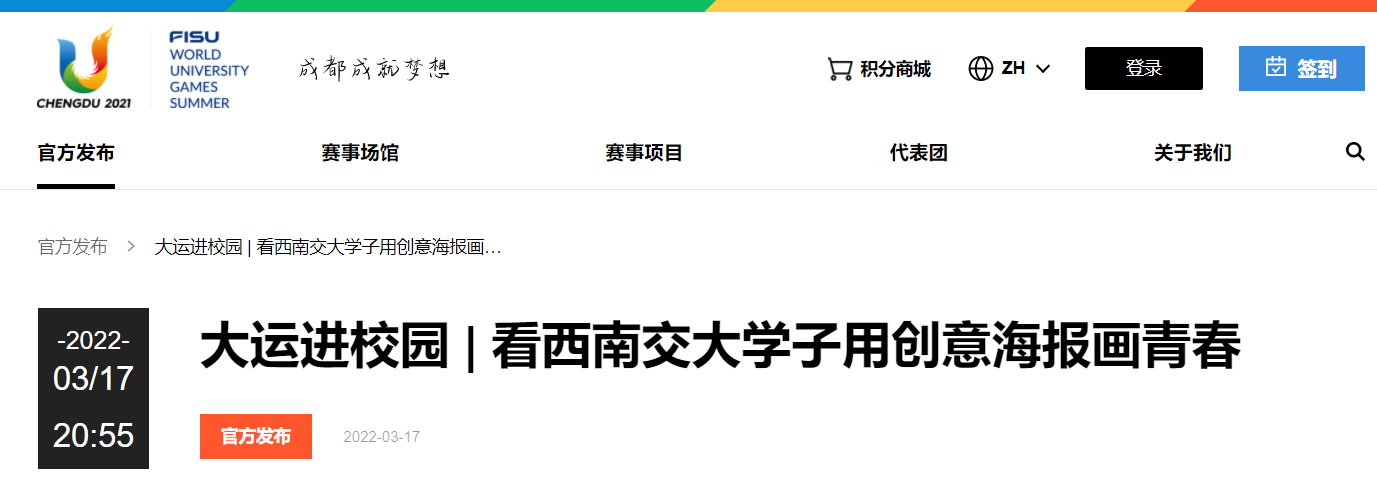 3月17日,在成都第31届世界大学生大运会开幕倒计时100天之际,一场以成都大运会为主题的海报展在西南交通大学美术馆盛大开展。本次展出得到了大运会官网和今日头条、四川观察等媒体的报道,让世界看到了交大学子积极参与社会活动和公益实践的风采,本次展出由校团委、 包子漫画