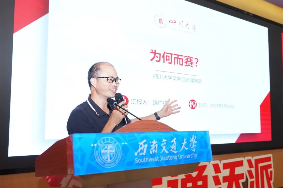 随后,大广赛四川赛区副秘书长、四川大学文学与新闻学院饶广祥教授对大广赛的竞赛命题、赛程安排、参赛要点进行了介绍。他指出,大广赛竞赛命题丰富,为参赛学生提供了文字、图像、视频、声音以及直播等多种赛道,并且始终坚持公平评审、赛后充分复盘。其中,饶广祥教授特别强调了参赛学生在参加大广赛之前应当明确参加比赛的真正原因,鼓励参赛学生通过大广赛突破自身专业能力上限、找到自信和努力的方向,真诚希望每位同学在比赛中用最大的努力成就最好的自己。