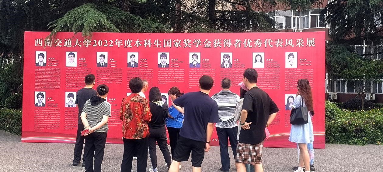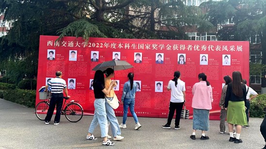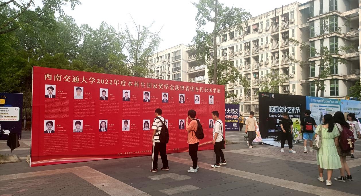 线下设计制作西南交通大学2022年度本科生国奖获得者优秀代表风采展示宣传展架,对“榜样人物”进行多点位展示,分别陈列于犀浦九里两校区主要教学楼周围,引发大批师生驻足观看,反响热烈。让广大同学真正感受到榜样就在身边,切实以榜样为引领,与榜样同路前行。