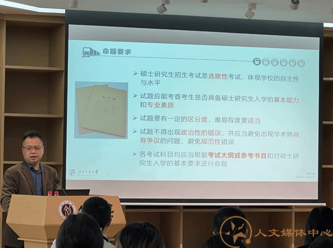 会议第二项议程,学院领导通报近期重要工作。沈如泉副院长通报了学科评估及建设有关工作情况。之后,沈院长对2024年硕士研究生入学考试自主命题的具体要求及评卷工作进行了工作部署。他强调,研究生招生工作是国家选拔高层次专门人才的重要途径,事关考生及家庭切身利益、关乎社会和谐稳定、乃至国家教育公平及创新发展。参与学校自主命题工作的老师要站在“为党育人、为国育才”的高度,深刻认识自命题工作的极端重要性、复杂性和敏感性。同时,他特别说明了有关命题工作保密规定、命题人员组织要求及评卷工作安排的相关内容。沈院长提醒老师们,研究生自命题评卷是政治任务,要认识到其重要性和纪律性。要牢记初心,增强使命感和责任感, 提高思想认识,坚持底线思维,严守保密纪律。“保质、保量、按时”完成任务。