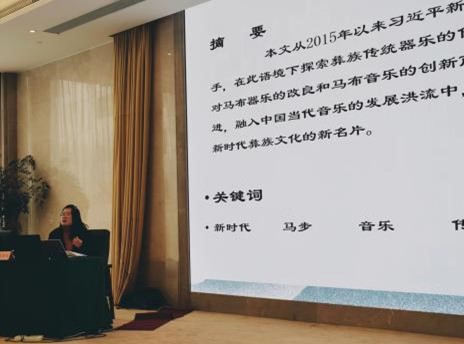 李珊副教授发表了题为《穿越时代的美姑河之声—新时代语境下彝族器乐马步传承探究》的论文。李珊老师在大会中就该论文展开学术演讲,从习近平新时代中国特色社会主义思想的文化篇入手,在此语境下探索彝族传统乐器的传承和保护问题,在长期的调研和关注中,对马布乐器的改良和马布音乐的创新两个方面提出建议,希望马布与时俱进,融入中国当代音乐的发展洪流,发挥其文化价值,成为新时代彝族文化传播的新名片。