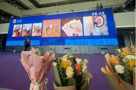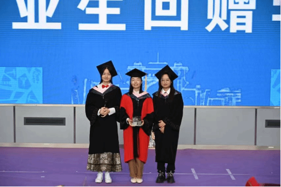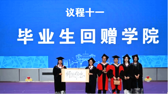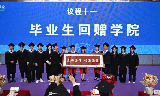 罗妍妍书记、刘占祥院长共同为校友理事颁发证书后,罗书记代表学院为全体毕业生送上学院的毕业礼物。一支针织向日葵代表一路向阳、一路生花;一支太阳神鸟书签则代表了成都、交大对毕业生的祝福,提醒人文学子继续保持对生活的热爱;竹、玉兰和松柏三款胸针则寓意着前程似锦、友情常驻、不畏艰难、永攀高峰。罗妍妍书记祝福毕业生们,以青春之姿奋力拼搏,投身新时代的伟大实践中,不忘初心、不负韶华、勇毅前行。